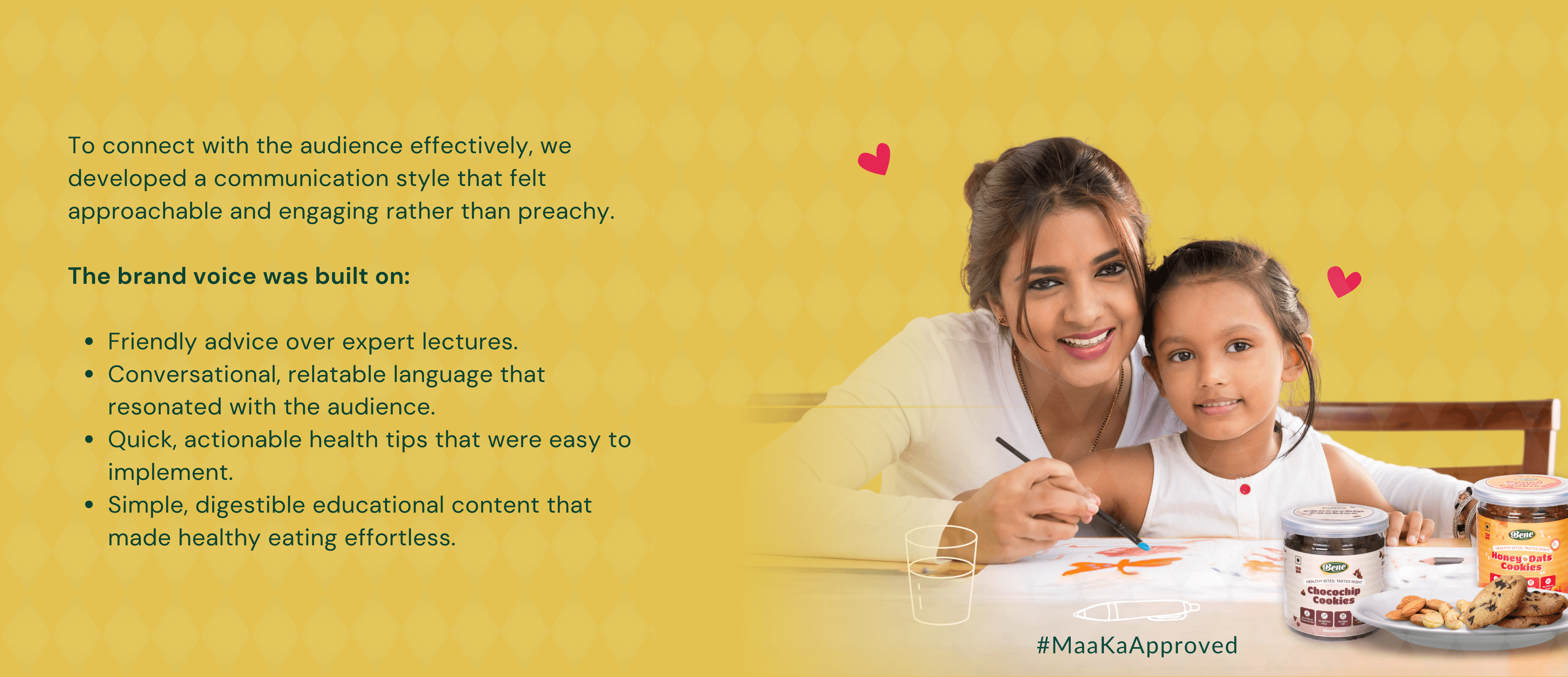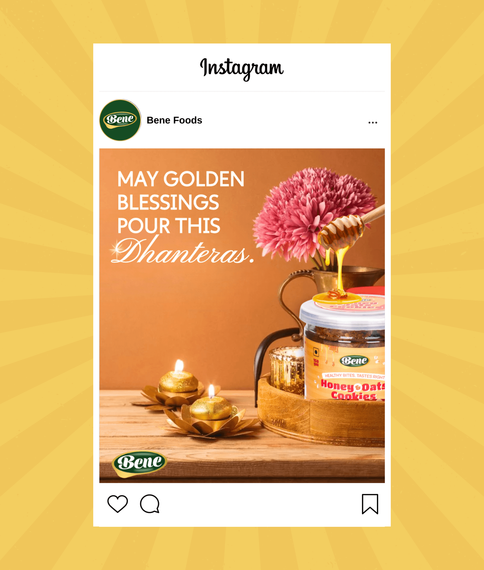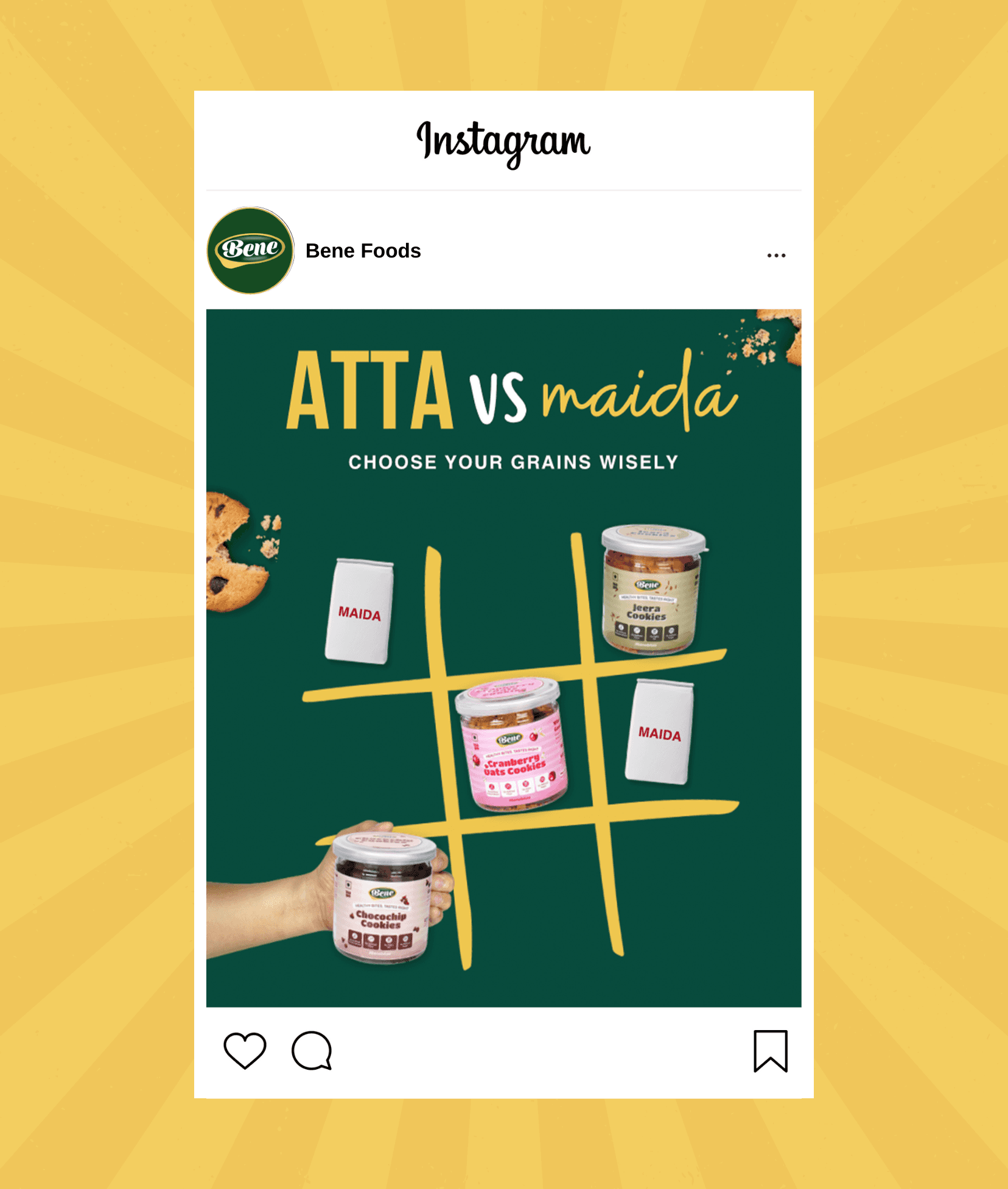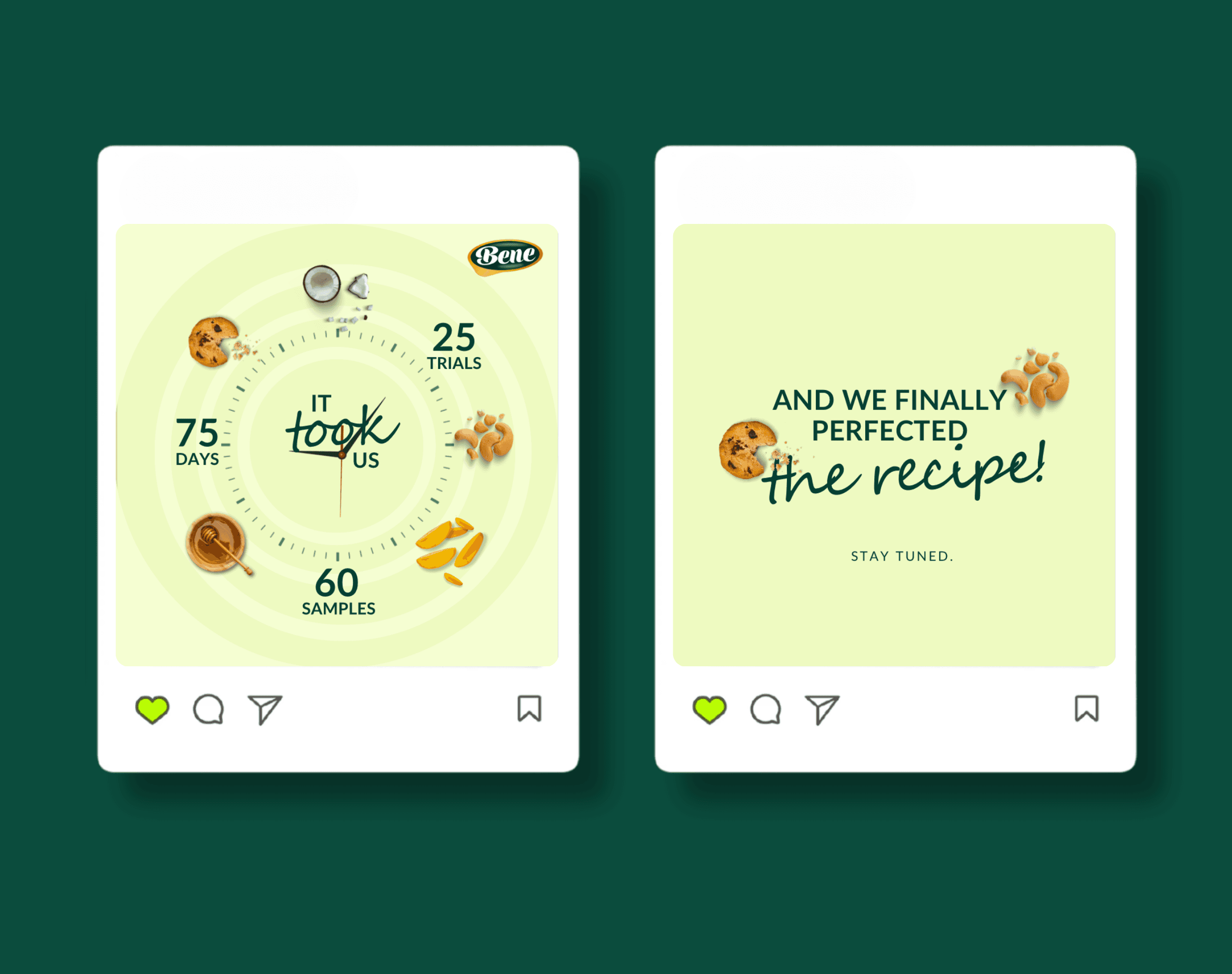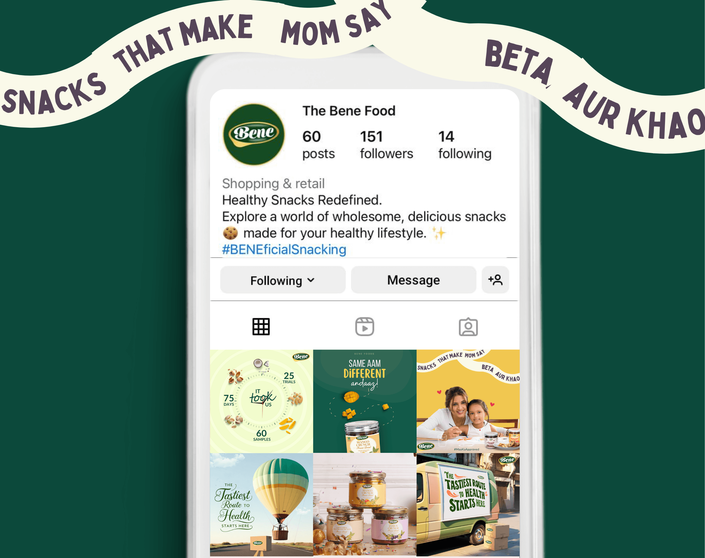 Bene’s visual language needed to strike a balance between fun and sophistication while reinforcing its premium positioning. To achieve this, we used clean layouts combined with vibrant colors to create a fresh, modern feel. Lifestyle-focused imagery was incorporated to make healthy snacking appear aspirational, while storytelling rooted in real-life moments helped build an emotional connection with the audience.