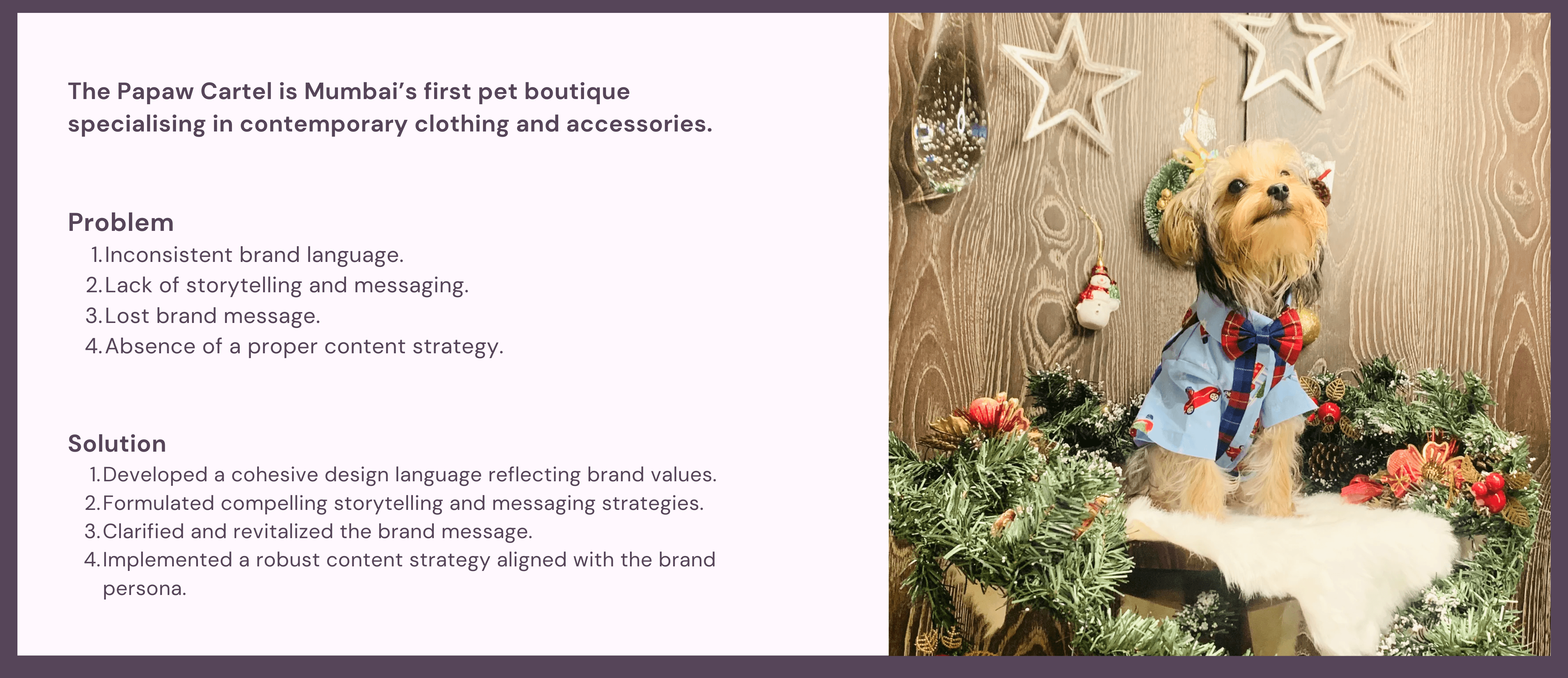 The Papaw Cartel (TPC), Mumbai's first boutique specialising in contemporary pet clothing and accessories, approached us with a key challenge: they had an ambitious vision but lacked a cohesive identity and content strategy to communicate it effectively.